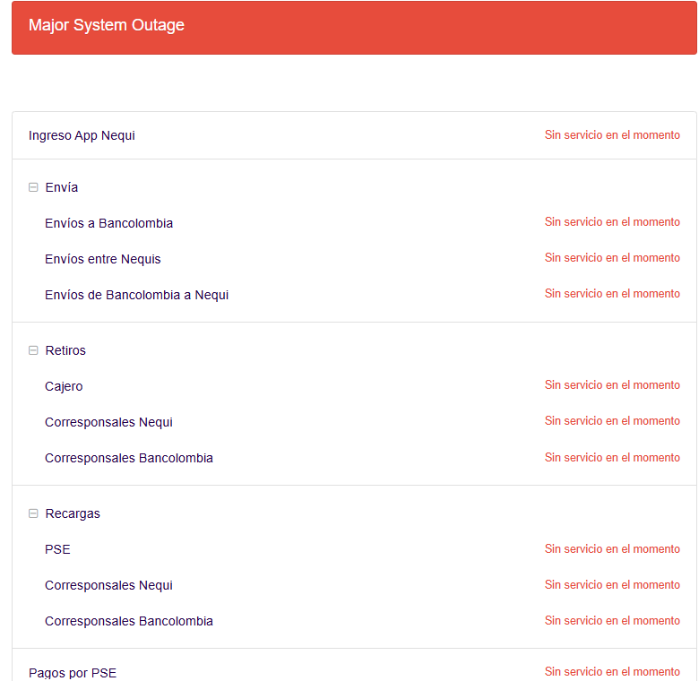 Según la propia plataforma, están sin servicio los siguientes servicios: ingreso a la app, envíos a Bancolombia, envíos entre usuarios Nequi, envíos de Bancolombia a Nequi, retiros en cajeros, corresponsales, recargas, pagos por PSE, tarjeta Nequi, QR entre cuentas.