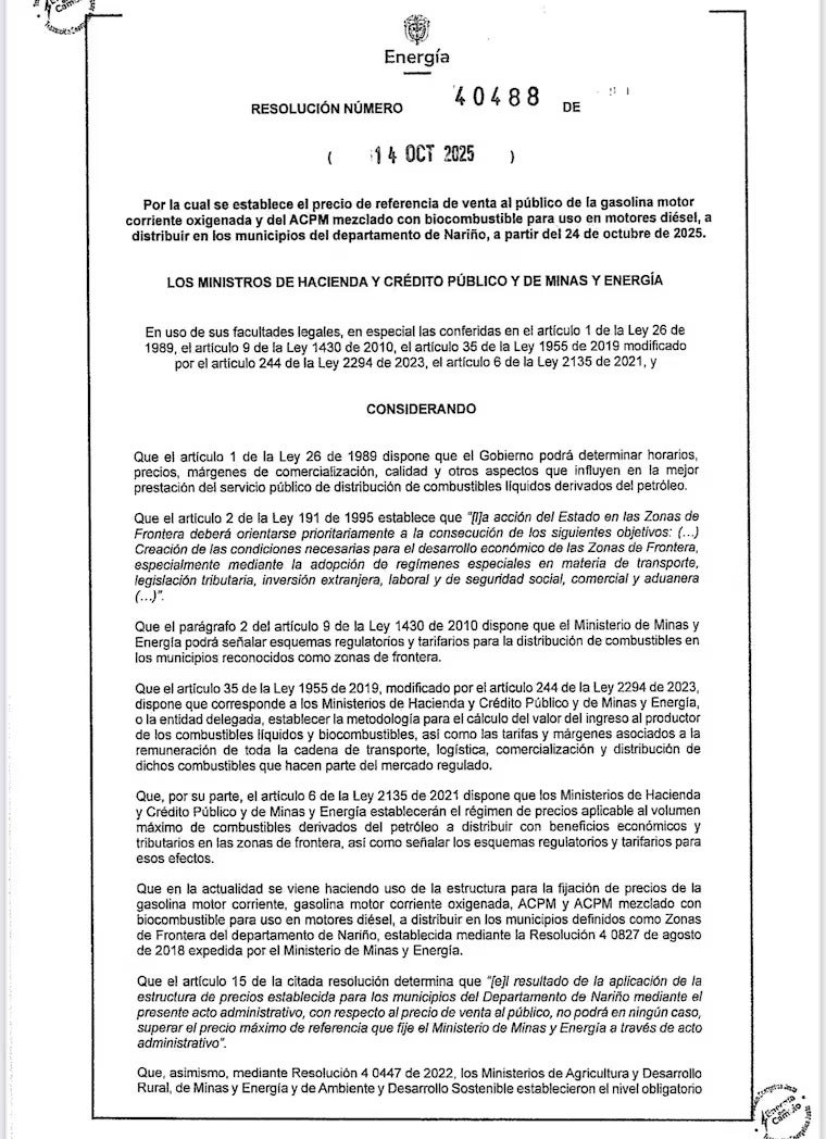 La medida, oficializada mediante la Resolución 40488 del 14 de octubre de 2025, entró en vigencia este viernes 24 de octubre y forma parte de los ajustes periódicos establecidos para mantener el equilibrio del mercado de combustibles.