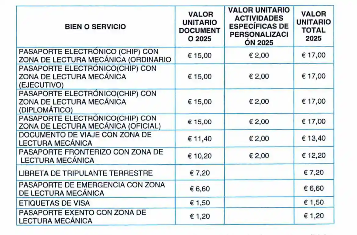 La Cancillería emitió un documento en el que se explica las condiciones de variabilidad en las nuevas tarifas de pasaporte que tienen un costo base de €17 (EUR) que equivalen a $80.416 (COP).