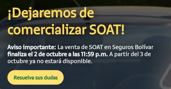 A través de su página oficial, Seguros Bolívar anunció que la venta de SOAT finalizará el 2 de octubre de 2025 a las 11:59 p.m.. Desde el 3 de octubre ya no estará disponible este producto dentro de su portafolio, decisión que la compañía catalogó como un “ajuste de negocio”.