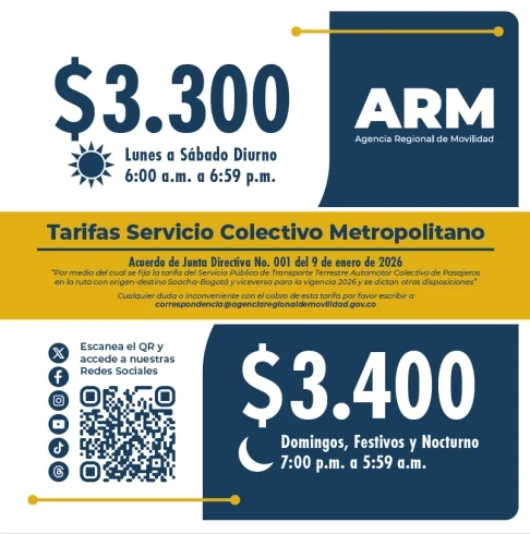Desde el 13 de enero de 2026, rige la nueva tarifa del transporte público en la ruta Soacha–Bogotá y viceversa, establecida por la Agencia Regional de Movilidad mediante el Acuerdo de Junta Directiva N.º 001 del 9 de enero de 2026.