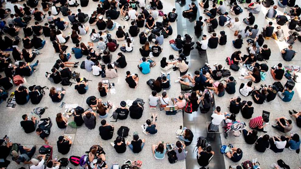 La decisión llega después de que cientos de manifestantes prodemocracia llegaran al aeropuerto por segundo día consecutivo y bloquearan a los pasajeros en las zonas de salidas en las dos terminales.