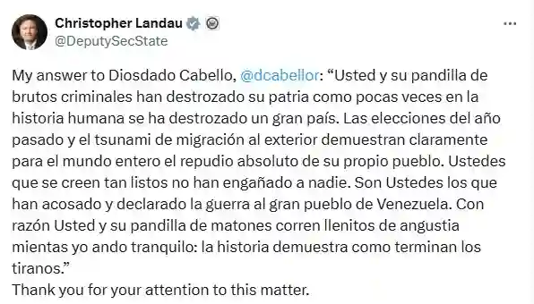 Tras estas afirmaciones, Christopher Landau, subsecretario de Estado de EE. UU., envió un contundente mensaje a través de su cuenta de X.
