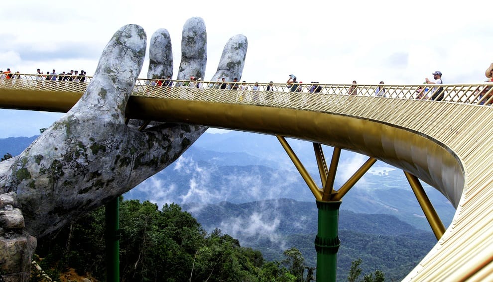 El puente de 150 metros de longitud, que se eleva a 1.400 metros de altitud y sostenido por dos manos gigantes se convirtió en una de las principales atracciones turísticas de Vietnam.