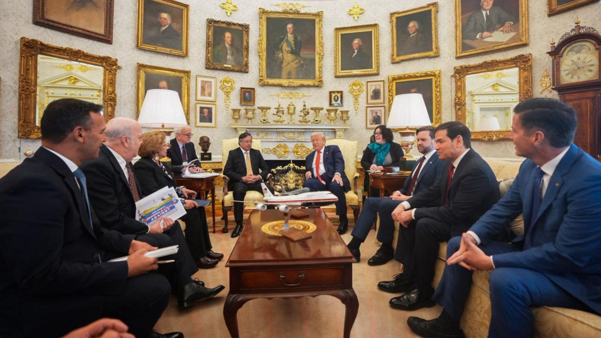 En las fotografías se observa a Petro ingresando al Salón Oval acompañado por la canciller Rosa Villavicencio y el embajador de Colombia en Estados Unidos, Daniel García Peña. Frente a ellos, el presidente Trump aparece junto al vicepresidente J.D. Vance y el secretario de Estado Marco Rubio.