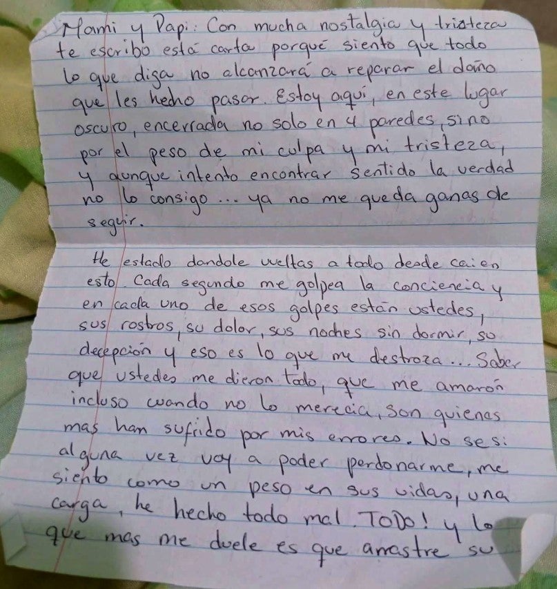 A puño letra, en una hoja, pidió perdón a sus padres por el sufrimiento que están viviendo y confiesa que su salud emocional está deteriorada.