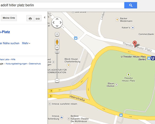 Unos días atrás saltó a los medios que asimismo se identificaba en Google como "Adolf-Hitler-Platz" la plaza de Berlín que ahora lleva el nombre de Theodor Heuss, en memoria de quien fue el primer presidente de la República Federal de Alemania (RFA).