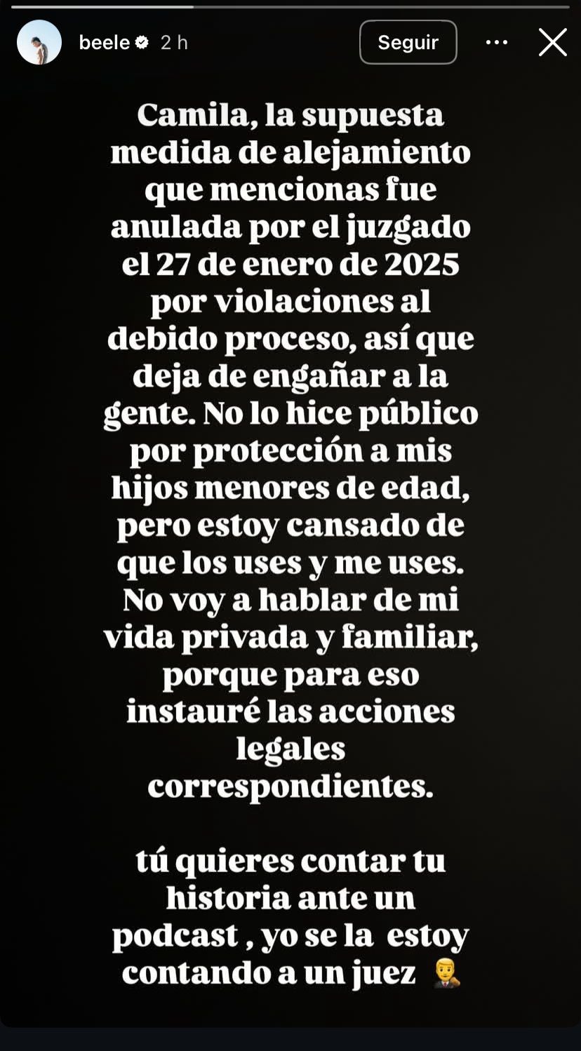 "Camila la supuesta medida de alejamiento que mencionas fue anulada el 27 de enero de 2025 por violaciones al debido proceso, así que deja de engañar a la gente", escribió Beele.