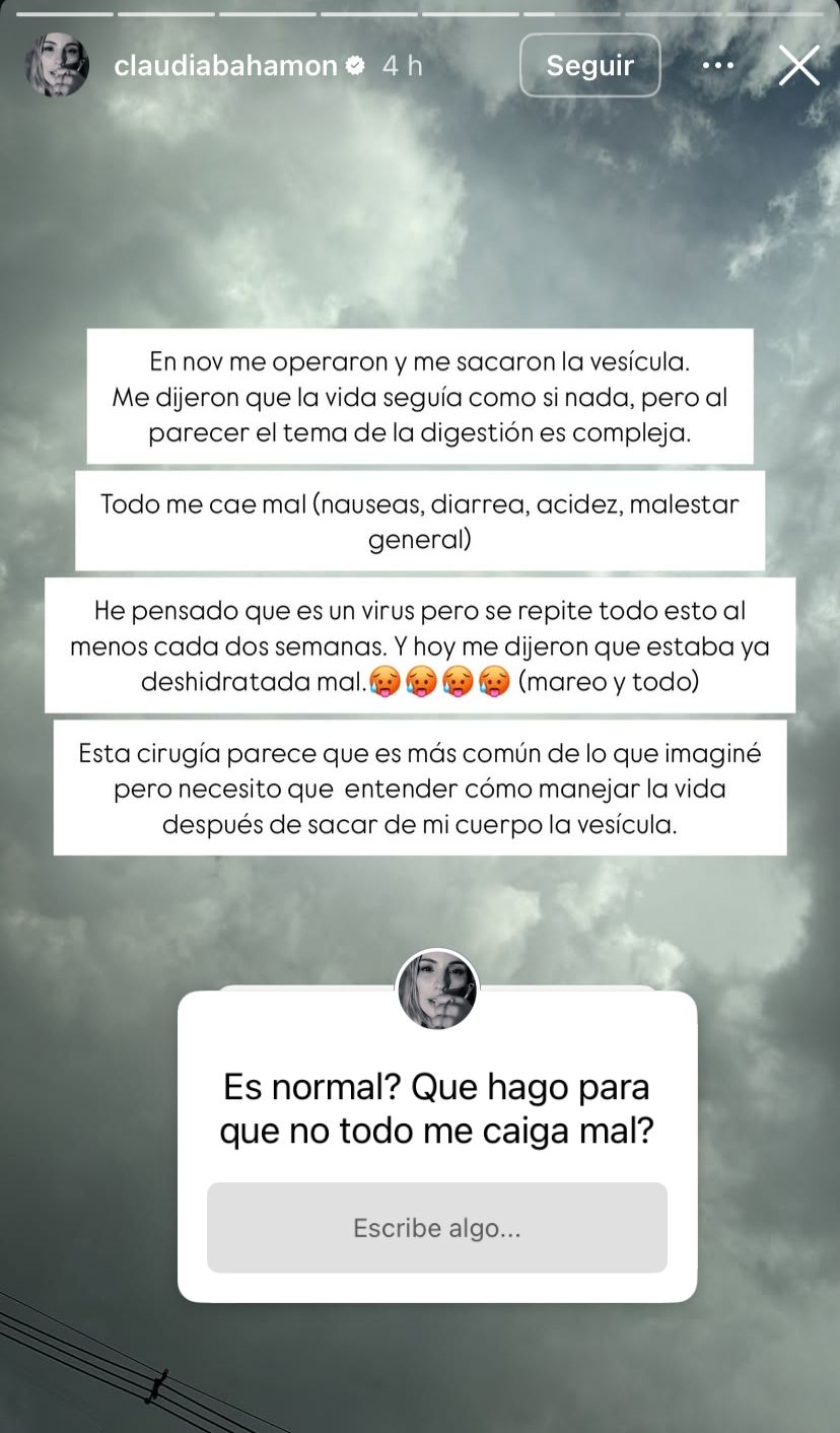 "Me operaron y me sacaron la vesícula. Me dijeron que la vida seguía como nada, pero al parecer el tema de la digestión es complejo", escribió Claudia Bahamón en la red social.