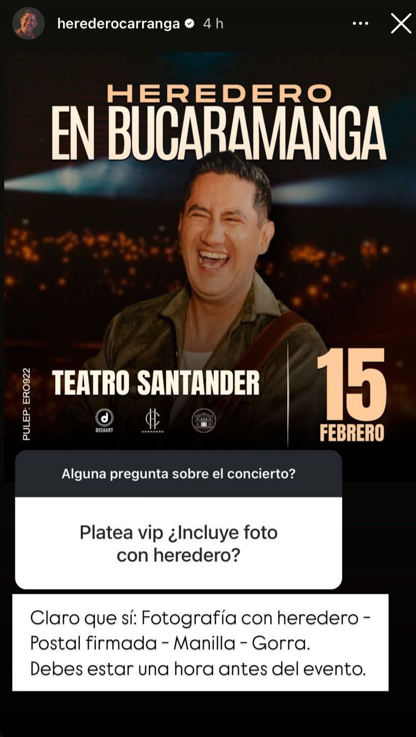 "Este 15 de febrero, el Teatro Santander se llena de alegría, poesía, cultura y mucha carranga, con la presencia de Heredero", escribió el artista en su cuenta de Instagram.