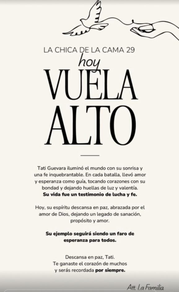 "Tati Guevara iluminó el mundo con su sonrisa y una fe inquebrantable. En cada batalla, llevó amor y esperanza como guía, tocando corazones con su bondad y dejando huellas de luz y valentía. Su vida fue un testimonio de lucha y fe", escribieron en una historia de Instagram.