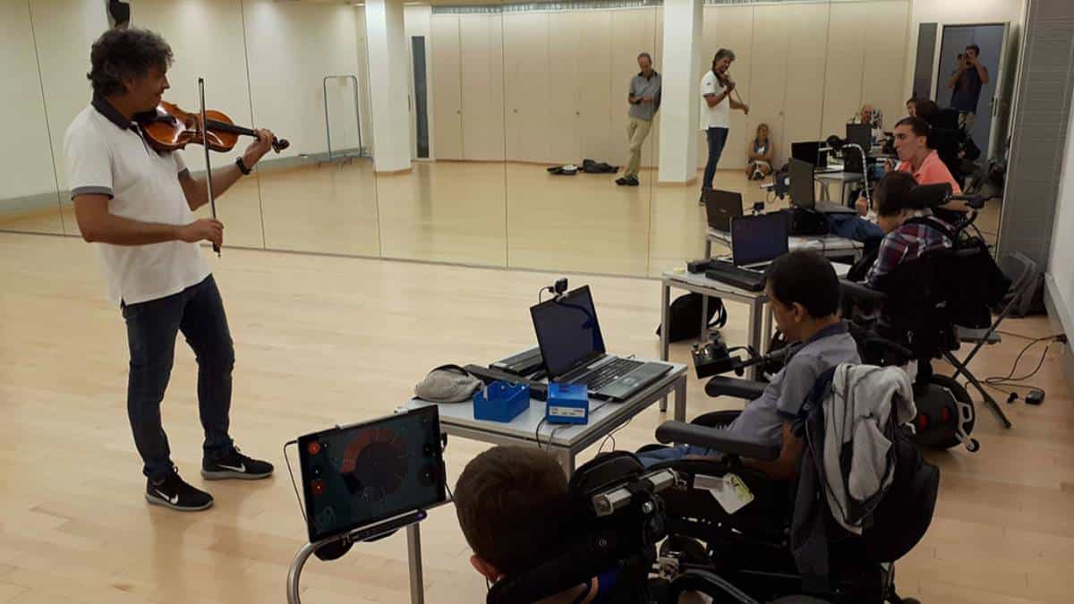 La estudiante con parálisis cerebral toca usa el software para interpretar el instrumento musical.