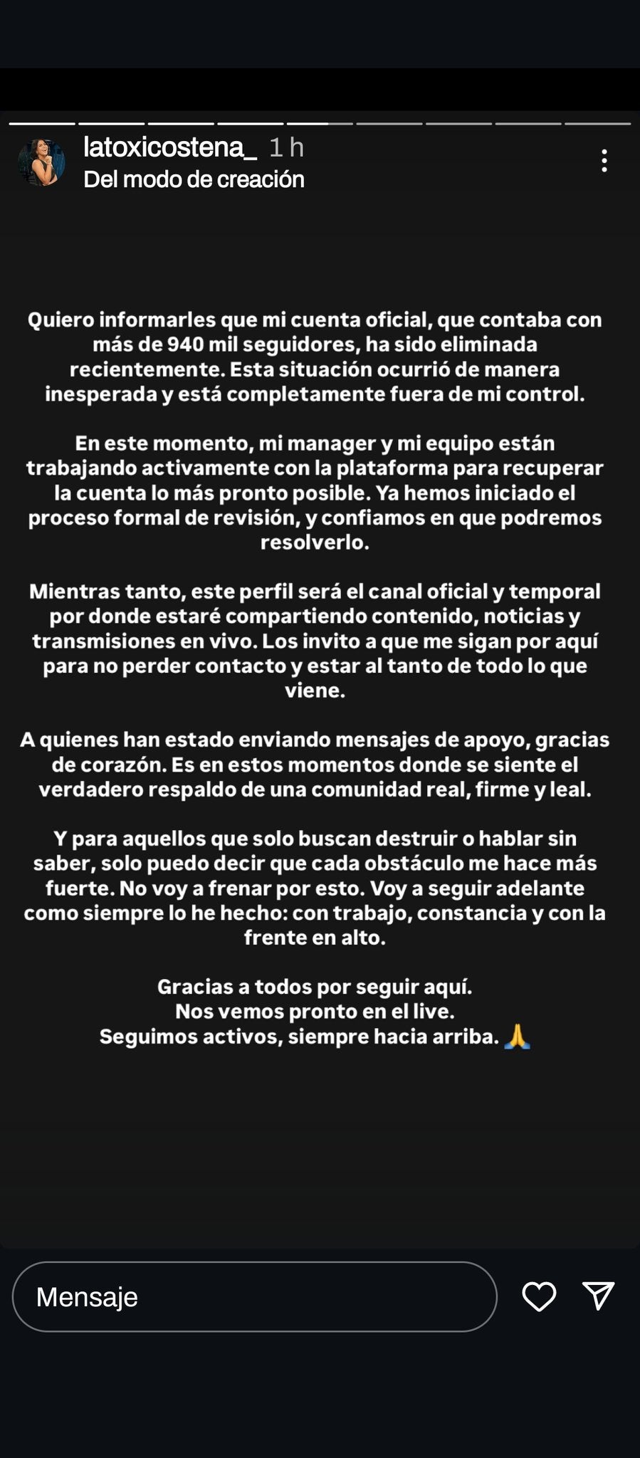 "Mi cuenta oficial, que contaba con 940.000 seguidores, ha sido eliminada recientemente. esta situación fue inesperada y está fuera de mi control", inició.