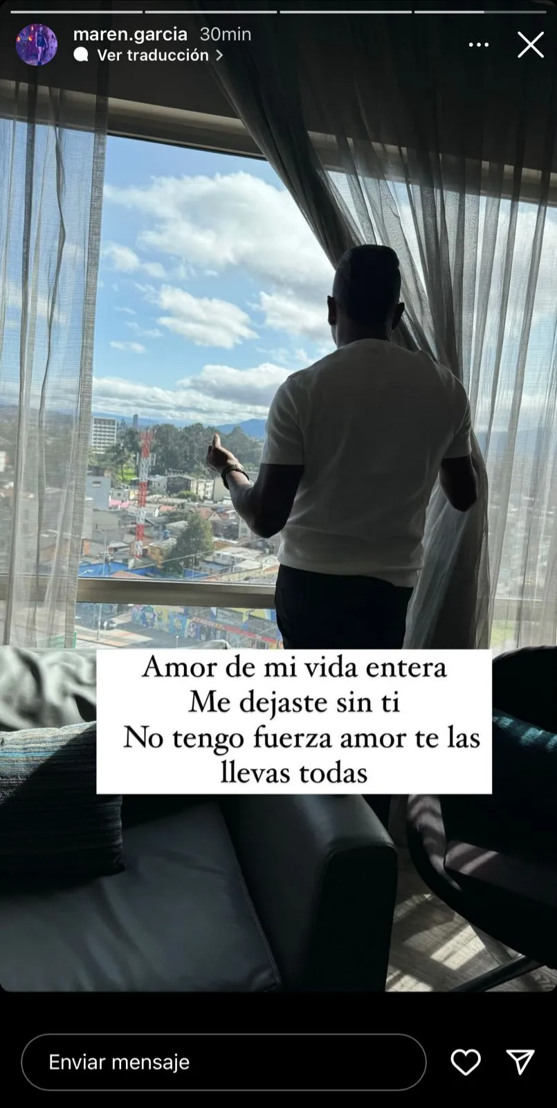 "Amor de mi vida entera, me dejaste sin ti, no tengo fuerzas, amor, te las llevas todas", publicó Maren a través de una historia de Instagram.